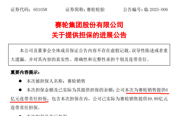 【炭黑產(chǎn)業(yè)網(wǎng)】2月11日消息,賽輪輪胎近日透露,其旗下全資子公司——賽輪輪胎銷售有限公司,已成功與一家商業(yè)銀行締結(jié)了授信業(yè)務(wù)合作關(guān)系。依據(jù)2月7日簽署的《最高額保證合同》,賽輪輪胎為相關(guān)業(yè)務(wù)提供了高達(dá)6億元的連帶責(zé)任保證擔(dān)保。截至目前,賽輪輪胎為其銷售子公司提供的連帶責(zé)任擔(dān)??傤~已累計(jì)達(dá)到49.89億元。