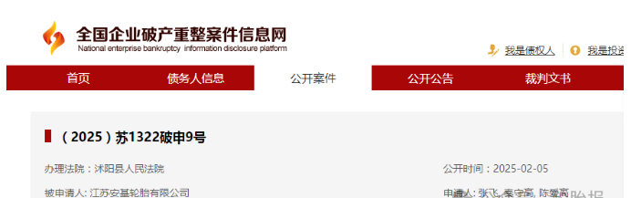 近日,江蘇省宿遷市沭陽縣人民法院公布了一起涉及輪胎行業(yè)的破產(chǎn)重組案件。案件申請人代表張某、秦某高、陳某高,針對江蘇安基輪胎有限公司提起破產(chǎn)申請。據(jù)悉,這家輪胎公司因長期拖欠員工工資而引發(fā)關(guān)注。