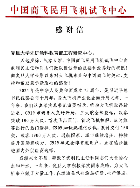 中國商飛民用飛機試飛中心在感謝信中提到,“復旦大學武利民團隊在涂層研發(fā)、生產(chǎn)供應和現(xiàn)場服務等全流程工作中提供了有力支持,成功解決了檢測靈敏度和極端環(huán)境適應性等關鍵問題,為大飛機試飛驗證的成功做出了重要貢獻”。