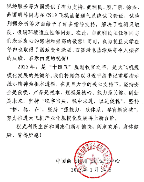 喜報丨為大飛機試飛驗證成功做出重要貢獻,復旦大學武利民團隊收到感謝信