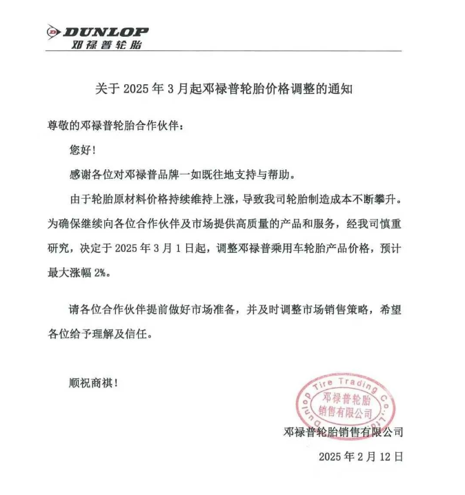 【炭黑產(chǎn)業(yè)網(wǎng)】2月13日消息,近日,鄧祿普輪胎銷售有限公司宣布了一項(xiàng)重要決策,將自2025年3月1日起對(duì)其乘用車輪胎產(chǎn)品進(jìn)行價(jià)格調(diào)整。這一決定背后,是輪胎原材料價(jià)格持續(xù)上漲所帶來(lái)的制造成本壓力。