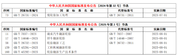 【炭黑產(chǎn)業(yè)網(wǎng)】2月13日消息,為積極響應(yīng)國家提升牽引設(shè)備更新、促進(jìn)消費(fèi)的政策號召,全國輪胎輪輞標(biāo)準(zhǔn)化技術(shù)委員會(huì)在2024年積極行動(dòng),制修訂了6項(xiàng)關(guān)鍵性國家標(biāo)準(zhǔn),旨在完善廢舊輪胎綜合利用的標(biāo)準(zhǔn)體系。這些標(biāo)準(zhǔn)包括GB/T 26731—2024《廢輪胎加工處理技術(shù)規(guī)范》、GB/T 45292—2025《輪胎翻新生產(chǎn)基本條件》、GB/T 26732—2025《輪胎翻新工藝流程》、GB/T 14646—2025《轎車翻新輪胎質(zhì)量標(biāo)準(zhǔn)》、GB/T 7037—2025《載重汽車翻新輪胎規(guī)范》以及GB/T 45291—2025《工程機(jī)械翻新輪胎要求》。近日,這6項(xiàng)國家標(biāo)準(zhǔn)已正式發(fā)布(詳見中華人民共和國國家標(biāo)準(zhǔn)發(fā)布公告〔2024第32號〕及〔2025第2號〕)。