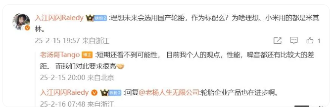【炭黑產(chǎn)業(yè)網(wǎng)】2月17日消息,理想汽車第一產(chǎn)品線總裁湯靖近日在社交媒體上就公司未來是否會采用國產(chǎn)輪胎作為標配的問題,發(fā)表了個人見解。他明確指出,在可預(yù)見的未來,這種轉(zhuǎn)變的可能性并不大。湯靖解釋,這主要是因為國產(chǎn)輪胎在性能指標及噪音控制技術(shù)與公司現(xiàn)行的標準相比,仍存在顯著的差距,而理想汽車對這兩方面的要求極為嚴格。