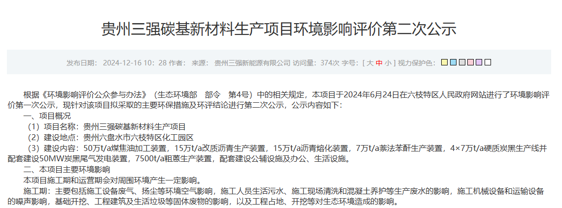 【炭黑產(chǎn)業(yè)網(wǎng)】2月18日消息,六枝特區(qū)人民政府日前發(fā)布了《貴州三強碳基新材料項目環(huán)境影響評價第二次公示》。