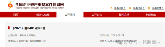 近日,全國企業(yè)破產(chǎn)重整案件信息網(wǎng)公開了山東億諾工程輪胎有限公司的破產(chǎn)審查案件。