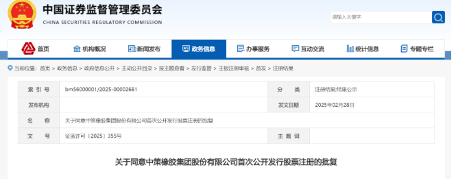 近日,中國(guó)證監(jiān)會(huì)官網(wǎng)公示一則重磅消息:中策橡膠集團(tuán)股份有限公司首次公開發(fā)行股票的注冊(cè)申請(qǐng)正式獲批!具體批復(fù)內(nèi)容如下: