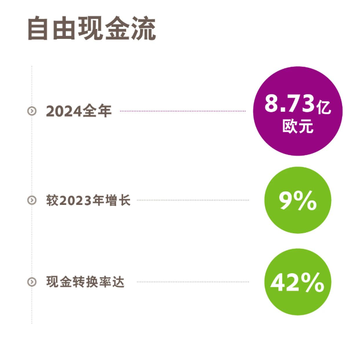 2024年,關(guān)注自由現(xiàn)金流的策略成效斐然。得益于較高的經(jīng)營(yíng)利潤(rùn)及對(duì)資本支出的持續(xù)嚴(yán)格管控,2024年自由現(xiàn)金流同比增長(zhǎng)9%,至8.73億歐元(2023年:8.01億歐元)?,F(xiàn)金轉(zhuǎn)換率達(dá)到42%,再次超過(guò)40%的目標(biāo)值。