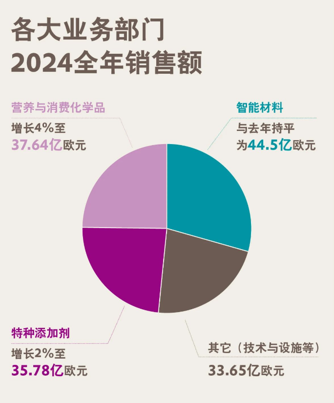 營(yíng)養(yǎng)與消費(fèi)化學(xué)品業(yè)務(wù)部門:銷售額增長(zhǎng)4%,達(dá)37.64億歐元,增長(zhǎng)主要?dú)w功于銷量的微增,以及動(dòng)物營(yíng)養(yǎng)業(yè)務(wù)銷售價(jià)格的同比上漲。動(dòng)物營(yíng)養(yǎng)的必需氨基酸業(yè)務(wù)受益于銷量的小幅增長(zhǎng)及銷售價(jià)格的顯著提升,實(shí)現(xiàn)了銷售額的大幅增長(zhǎng)。醫(yī)藥健康業(yè)務(wù)的銷售額與去年持平?;瘖y品活性成分的系統(tǒng)化解決方案業(yè)務(wù)延續(xù)了與往年相似的優(yōu)異表現(xiàn)。位于斯洛伐克的創(chuàng)新型鼠李糖脂(生物表面活性劑)生產(chǎn)設(shè)施于2024年首次貢獻(xiàn)了銷售額。主要?dú)w功于必需氨基酸產(chǎn)品價(jià)格的上漲和業(yè)務(wù)模式優(yōu)化帶來(lái)的成本節(jié)約,該業(yè)務(wù)部門調(diào)整后EBITDA同比增長(zhǎng)54%至6.01億歐元,調(diào)整后EBITDA利潤(rùn)率因此從上年同期的10.8%上升至16.0%。