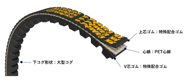 在材料構(gòu)成方面,“e-POWER NX”選用了上芯膠(特種復(fù)合橡膠)、芯絲(PET芯絲)、V芯橡膠(特種復(fù)合橡膠)以及下齒形(大齒)等優(yōu)質(zhì)材料。尺寸方面,該產(chǎn)品提供了AX(皮帶型)和BX(皮帶型)兩種規(guī)格,均涵蓋33~100英寸的尺寸范圍。