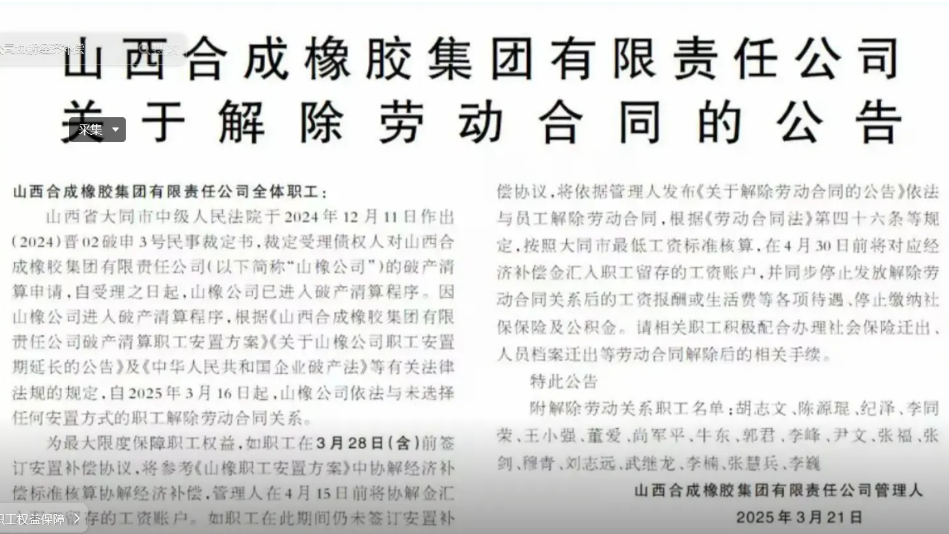 【炭黑產(chǎn)業(yè)網(wǎng)】3月27日消息,近日,在網(wǎng)上流傳著一張有關(guān)山西合成橡膠集團(tuán)有限責(zé)任公司解除勞動(dòng)合同的公告的圖片。
