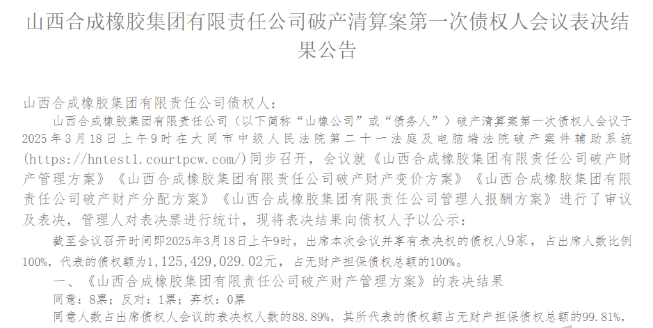 3月26日,山西合成橡膠集團(tuán)有限責(zé)任公司破產(chǎn)清算案第一次債權(quán)人會(huì)議表決結(jié)果公示。