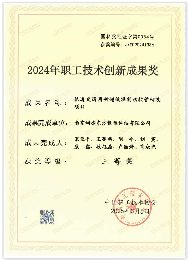 【炭黑產(chǎn)業(yè)網(wǎng)】3月28日消息,南京利德東方橡塑科技有限公司在技術(shù)創(chuàng)新領(lǐng)域再傳佳音,其主導(dǎo)的“耐超低溫軌道交通制動(dòng)軟管研發(fā)項(xiàng)目”在2024年度職工技術(shù)創(chuàng)新成果獎(jiǎng)評(píng)選中榮獲三等獎(jiǎng),彰顯了公司在軌道交通配件研發(fā)方面的雄厚實(shí)力。