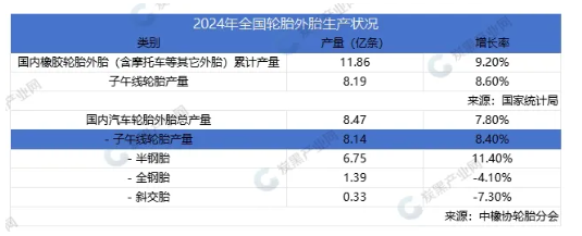 據(jù)業(yè)內(nèi)人士測(cè)算分析預(yù)計(jì),2025 全年國(guó)內(nèi)輪胎總產(chǎn)量增長(zhǎng)3%左右,其中,子午線輪胎總產(chǎn)量同比增長(zhǎng)3.2%(全鋼重載輪胎產(chǎn)量同比下降1.4%,半鋼輪胎產(chǎn)量同比增長(zhǎng)4.1%),斜交胎產(chǎn)量出口量同比下降 3%;生產(chǎn)成品總體看漲,國(guó)內(nèi)輪胎現(xiàn)價(jià)產(chǎn)值和銷售收入增幅預(yù)計(jì)大于產(chǎn)量增幅。