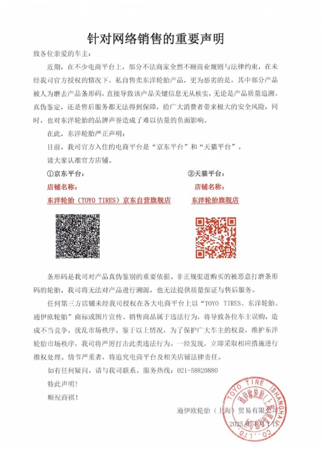 針對(duì)這一嚴(yán)峻形勢,東洋輪胎官方鄭重聲明,目前公司官方認(rèn)可并入駐的電商平臺(tái)僅有“京東平臺(tái)”和“天貓平臺(tái)”。消費(fèi)者在購買東洋輪胎產(chǎn)品時(shí),應(yīng)選擇正規(guī)渠道,以確保產(chǎn)品質(zhì)量和售后服務(wù)得到保障。對(duì)于非正規(guī)渠道購買的、被惡意打磨條形碼的輪胎,公司將無法提供溯源服務(wù),也無法給予質(zhì)量保證和售后支持。