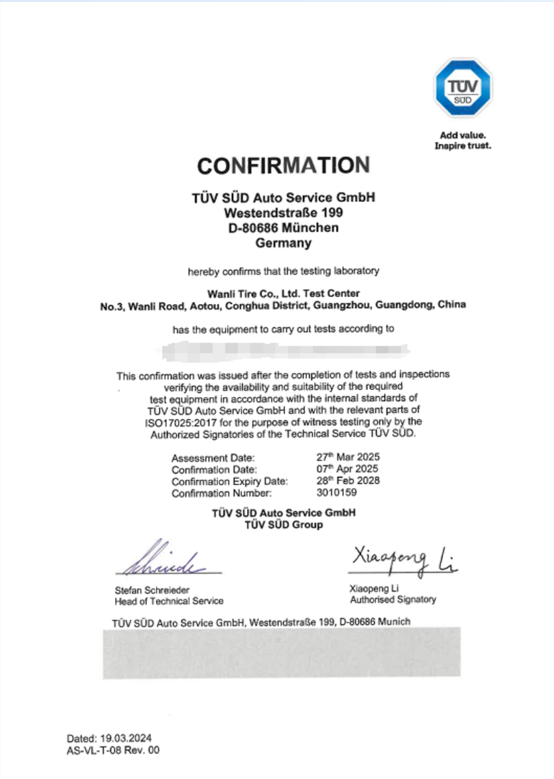 萬力輪胎檢測中心獲 TüV 南德歐盟認(rèn)證!
