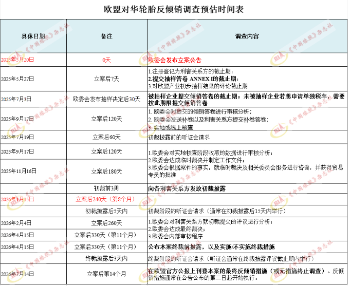 下表為法律機(jī)構(gòu)向《中國橡膠》雜志提供的歐盟對華輪胎反傾銷調(diào)查預(yù)估時間表。