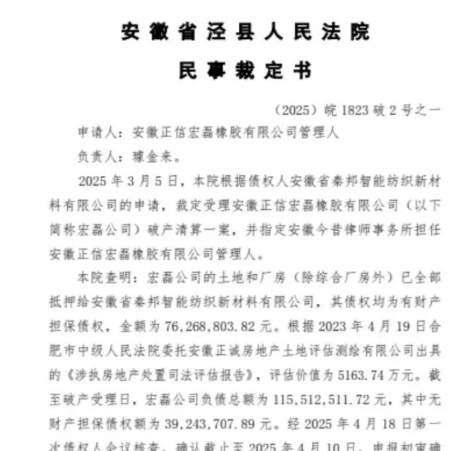2025年5月9日,安徽省涇縣人民法院作出(2025)皖 1823 破 2 號之一民事裁定,宣告安徽正信宏磊橡膠有限公司破產(chǎn)。