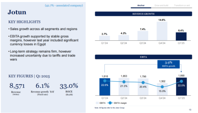 【炭黑產(chǎn)業(yè)網(wǎng)】5 月 12 日消息, 2025 年第一季度業(yè)績報告顯示,全球知名涂料企業(yè)佐敦表現(xiàn)出色,特別是在中國市場,成為拉動業(yè)績的重要力量。佐敦的大股東奧克拉 (Orkla) 于 5 月 9 日發(fā)布了這份業(yè)績報告。