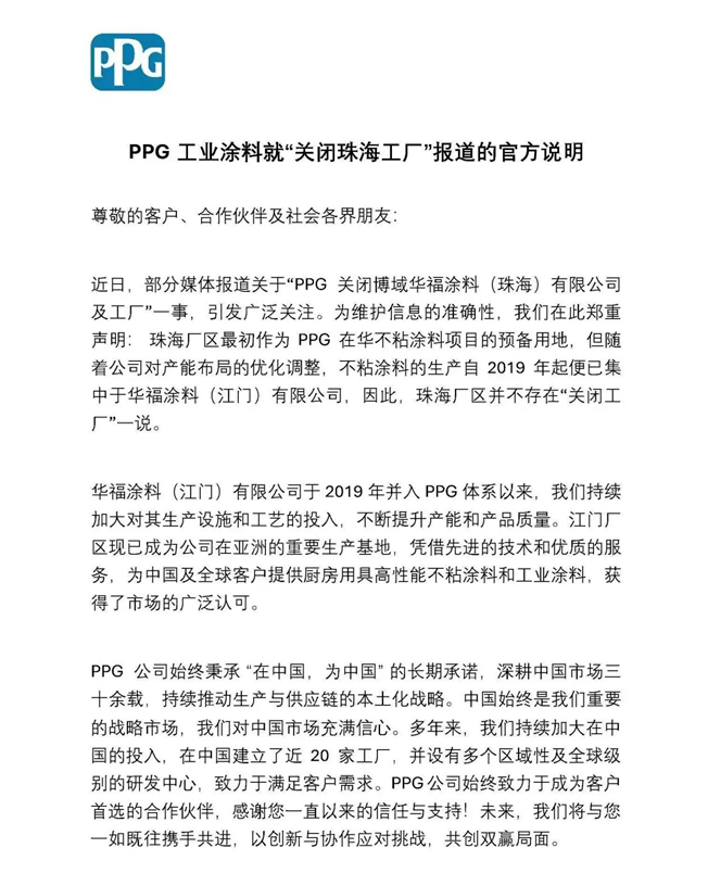 PPG辟謠珠海工廠關(guān)閉傳聞