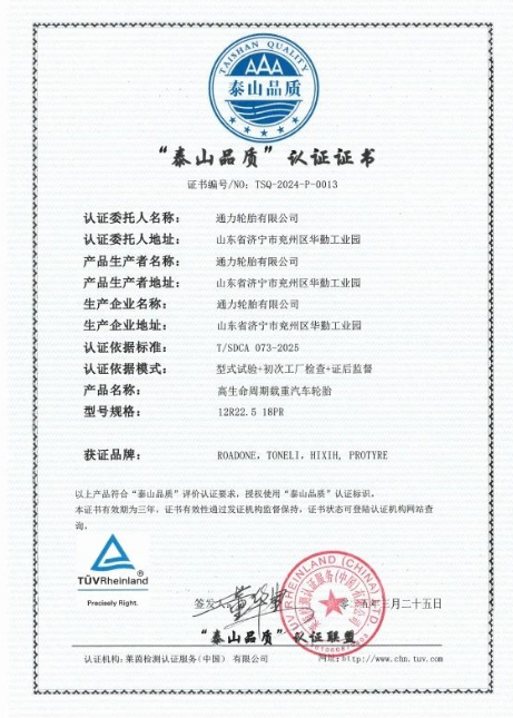 通力輪胎載重汽車輪胎斬獲“泰山品質(zhì)”認(rèn)證