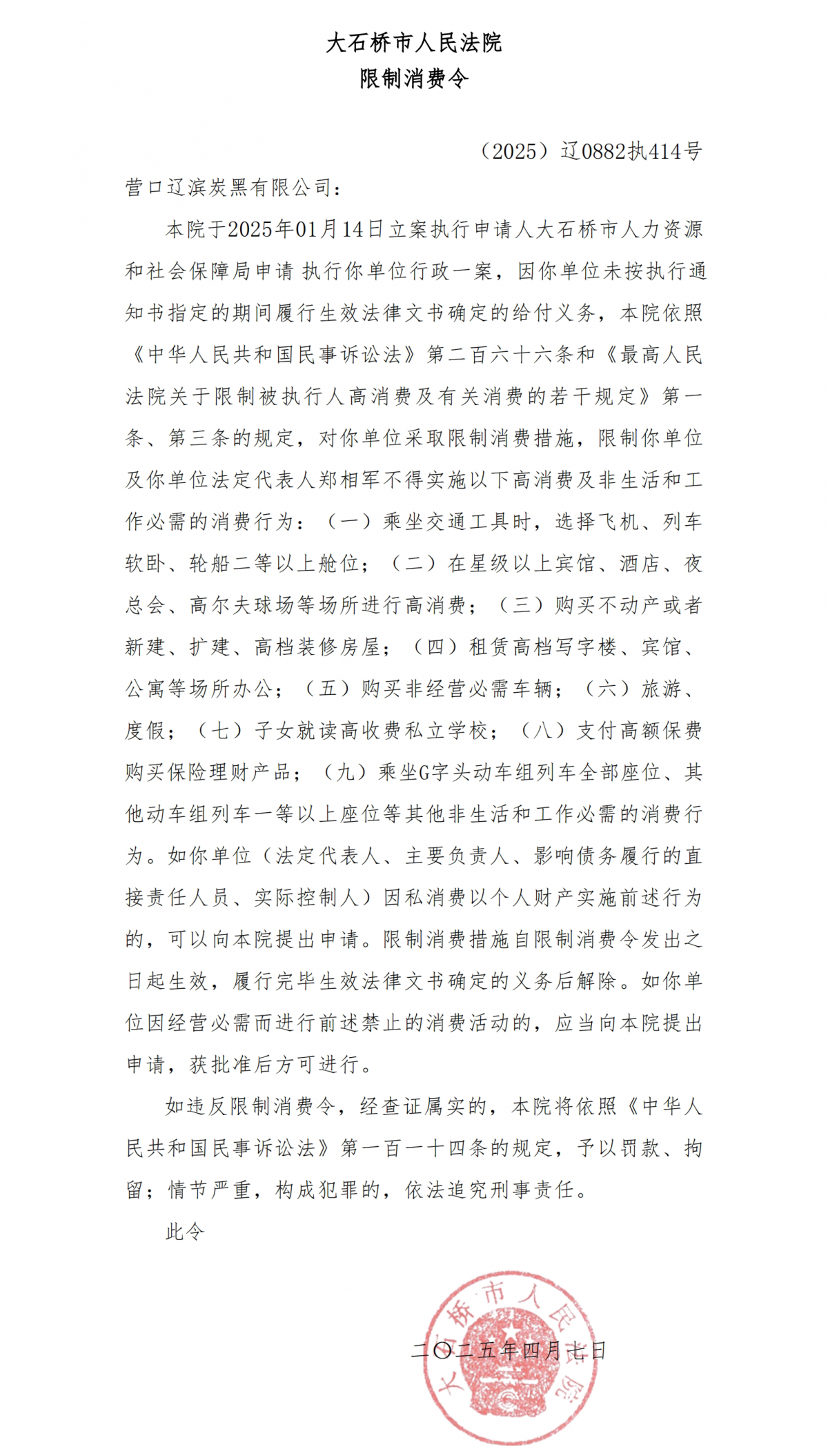 據(jù)炭黑產(chǎn)業(yè)網(wǎng)了解,自2024年以來,營口遼濱炭黑有限公司及其法定代表人鄭某已累計收到超過20次的限制消費令,案由廣泛涉及合同糾紛、借款糾紛以及稅務問題等多個方面。最近,大石橋市人民法院再次對其下發(fā)限消令。