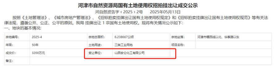 【炭黑產(chǎn)業(yè)網(wǎng)】6月4日消息,近日,山西省運城市河津市成交1宗工業(yè)用地,該地塊最終由山西安侖化工有限公司成功競得。