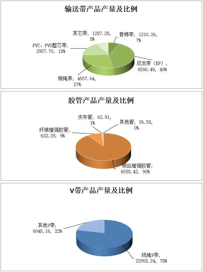 主導(dǎo)產(chǎn)品輸送帶完成1.81億㎡,同比增長(zhǎng)2.54%;其中:鋼繩帶完成0.46億㎡,同比增長(zhǎng)1.65%;輕型輸送帶完成173.45萬㎡,同比增長(zhǎng)35.34%;膠管完成1.32億Bm,同比增長(zhǎng)9.63%;其中:鋼絲增強(qiáng)膠管完成0.66億Bm,同比增長(zhǎng)9.42%;汽車專用膠管完成1.49億根,同比增長(zhǎng)19.94%;橡膠履帶完成12.55萬條,同比增長(zhǎng)20.10%;V帶完成2.81億Am,同比增長(zhǎng)8.02%;其中:線繩V帶完成2.21億Am,同比增長(zhǎng)7.41%;汽車專用V帶完成0.24條,同比下降1.87%。