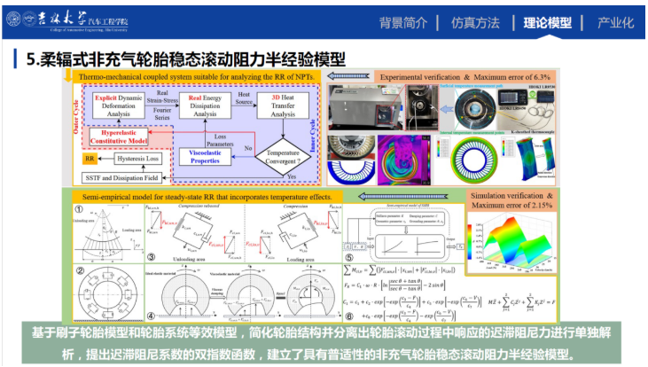 1.非充氣輪胎內(nèi)外循環(huán)熱力耦合仿真和輻條PVDF壓電應(yīng)變測量仿真方面開展了研究。解決了非充氣輪胎非連續(xù)輻條的熱力耦合滾阻特性仿真與溫度場計算的難題,并在此基礎(chǔ)上提出了穩(wěn)態(tài)滾動阻力半經(jīng)驗?zāi)P?,實現(xiàn)了對已參數(shù)識別非充氣輪胎不同工況下的滾阻高精度預(yù)測。