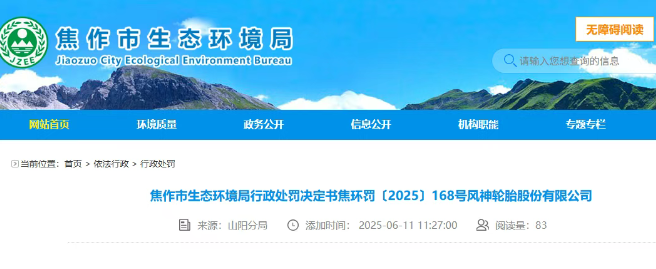 風(fēng)神輪胎重污染天減排不力,焦作環(huán)保局開罰單