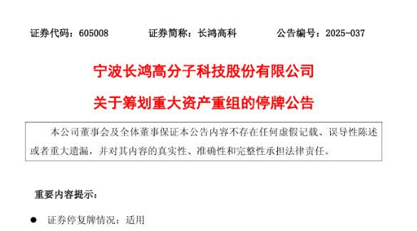 【炭黑產(chǎn)業(yè)網(wǎng)】7月8日消息,寧波長鴻高分子科技股份有限公司(以下簡稱“長鴻高科”)于 7 月 7 日晚間對(duì)外公布《關(guān)于籌劃重大資產(chǎn)重組的停牌公告》。此次資產(chǎn)重組被視作該公司在新材料領(lǐng)域深化戰(zhàn)略布局、培育新質(zhì)生產(chǎn)力以及增強(qiáng)產(chǎn)業(yè)鏈競爭力的關(guān)鍵一步。