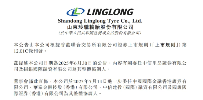 【炭黑產(chǎn)業(yè)網(wǎng)】7 月 17 日消息,中國(guó)輪胎行業(yè)領(lǐng)軍企業(yè)玲瓏輪胎的香港上市計(jì)劃又有新進(jìn)展。港交所文件顯示,該公司于 7 月 14 日新增四家機(jī)構(gòu)擔(dān)任整體協(xié)調(diào)人,分別為中國(guó)國(guó)際金融香港證券、華泰金融控股 (香港)、中信建投 (國(guó)際) 融資及國(guó)證國(guó)際證券 (香港)。此前,玲瓏輪胎已正式向港交所主板提交上市申請(qǐng),由中信證券與招銀國(guó)際出任聯(lián)席保薦人。截至 7 月 15 日收盤(pán),其 A 股股價(jià)報(bào) 14.88 元,對(duì)應(yīng)市值達(dá) 217.77 億元。