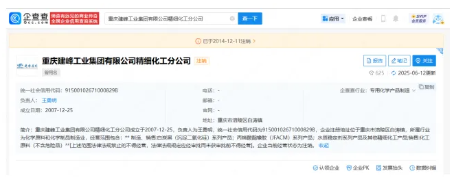 據(jù)了解,重慶建峰工業(yè)集團有限公司(原國營816廠)的歷史可追溯至1966年,原屬三線核軍工企業(yè),現(xiàn)為重慶化醫(yī)控股(集團)公司骨干企業(yè),在2007年11月整合白碳黑和特種橡膠生產(chǎn)業(yè)務(wù),并重組成立精細(xì)化工公司——即后來的重慶建峰工業(yè)集團有限公司精細(xì)化工分公司,然而該公司也因“決議解散”已于2014年12月11日注銷。
