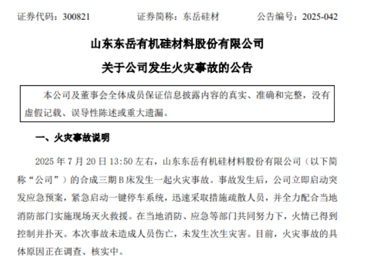 東岳硅材合成車間突發(fā)火災(zāi) 半數(shù)產(chǎn)能受影響
