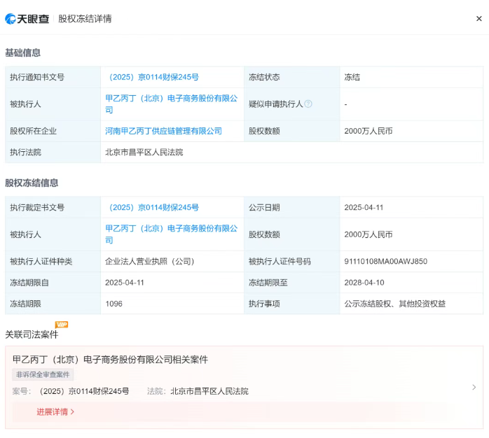 【炭黑產(chǎn)業(yè)網(wǎng)】7 月 28 日消息,近期,一則甲乙丙丁(北京)電子商務股份有限公司的股權(quán)凍結(jié)消息,在行業(yè)內(nèi)引發(fā)了廣泛關(guān)注。天眼查數(shù)據(jù)披露,該公司持有的河南甲乙丙丁供應鏈管理有限公司的 2000 萬人民幣股權(quán),已被北京市昌平區(qū)人民法院凍結(jié)。此次凍結(jié)從 2025 年 4 月 11 日起,將持續(xù)至 2028 年 4 月 10 日。