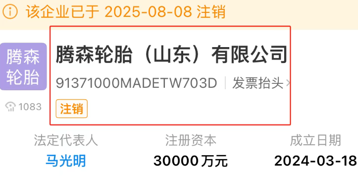 騰森輪胎山東公司,注銷!