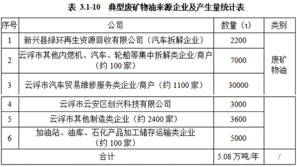 通過市場調(diào)查,據(jù)不完全統(tǒng)計(jì),本項(xiàng)目擬收集的廢礦物油主要來自①云浮市共有汽車貿(mào)易維修服務(wù)類企業(yè)/商戶約1200家,廢礦物油收集處理量約6.82萬噸/年。②制造業(yè)約2400家,廢礦物油收集處理量約1.32萬噸/年。③加油站、油庫、石化產(chǎn)品加工儲存運(yùn)輸類企業(yè)約100家,廢礦物油收集處理量約1萬噸。