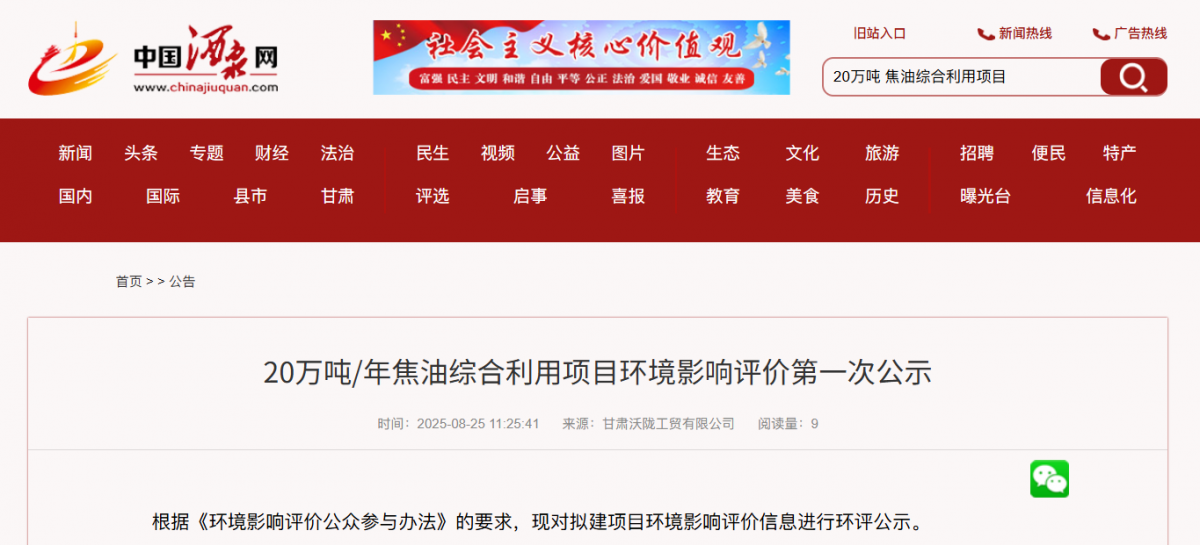 8月25日,甘肅沃隴工貿(mào)有限公司發(fā)布20萬噸/年焦油綜合利用項目環(huán)境影響評價第一次公示。