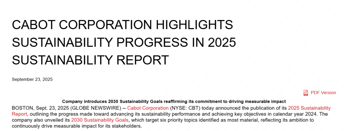 【炭黑產(chǎn)業(yè)網(wǎng)】9 月 25 日消息,卡博特公司(紐約證券交易所代碼:CBT)于 2025 年 9 月 23 日在波士頓發(fā)布《2025 年可持續(xù)發(fā)展報告》,披露 2024 年可持續(xù)發(fā)展績效及關(guān)鍵目標進展,同步公布 2030 年可持續(xù)發(fā)展目標。