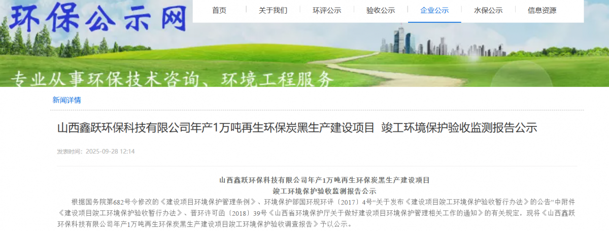 9月28日,《山西鑫躍環(huán)??萍加邢薰灸戤a(chǎn)1萬(wàn)噸再生環(huán)保炭黑生產(chǎn)建設(shè)項(xiàng)目竣工環(huán)境保護(hù)驗(yàn)收調(diào)查報(bào)告》公示。