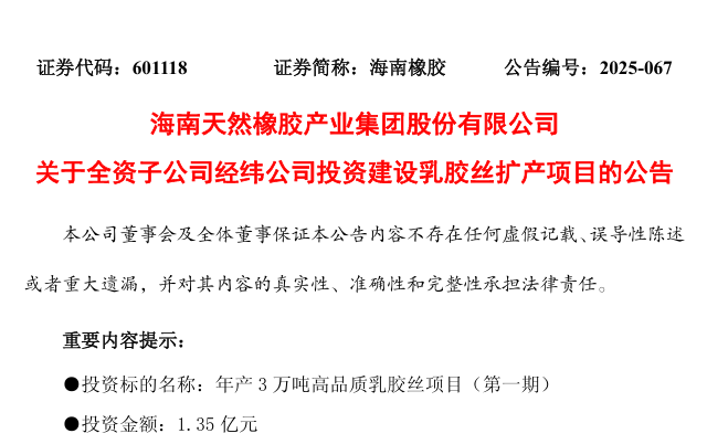海南橡膠產(chǎn)業(yè)集團股份有限公司(證券代碼:601118,簡稱“海南橡膠”)10月31日發(fā)布公告稱,公司全資子公司海南經(jīng)緯乳膠絲有限責(zé)任公司(簡稱“經(jīng)緯公司”)擬投資1.35億元建設(shè)年產(chǎn)3萬噸高品質(zhì)乳膠絲項目(第一期)。項目建成后,經(jīng)緯公司乳膠絲年產(chǎn)能將新增1.5萬噸,進一步鞏固其行業(yè)龍頭地位。