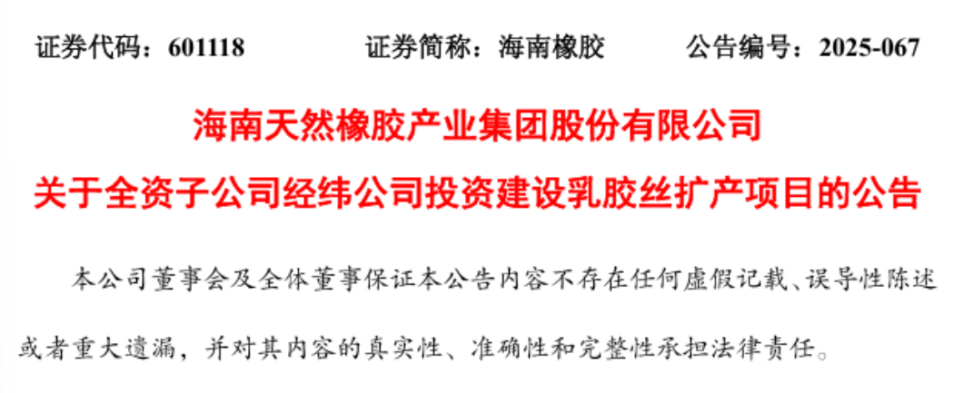 【炭黑產(chǎn)業(yè)網(wǎng)】11 月 5 日消息,海南橡膠產(chǎn)業(yè)集團股份有限公司(證券代碼:601118,簡稱 “海南橡膠”)于 10 月 31 日發(fā)布公告,宣布其全資子公司海南經(jīng)緯乳膠絲有限責任公司(簡稱 “經(jīng)緯公司”)計劃投資 1.35 億元,啟動年產(chǎn) 3 萬噸高品質(zhì)乳膠絲項目(第一期)的建設。該項目投產(chǎn)后,經(jīng)緯公司乳膠絲年產(chǎn)能將新增 1.5 萬噸,其在行業(yè)內(nèi)的龍頭地位將得到進一步鞏固。