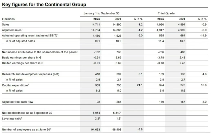 據(jù)炭黑產(chǎn)業(yè)網(wǎng)了解,2025年第三季度大陸集團合并銷售額達到49.5億歐元(約合405.9億人民幣),較去年同期小幅下降0.9%;若剔除匯率波動及整合范圍調(diào)整的因素,公司有機銷售額同比增長2.6%。集團調(diào)整后營業(yè)利潤為5.65億歐元(約46.33億人民幣),同比下滑14.9%,而去年同期調(diào)整后息稅前利潤因緯湃科技(Vitesco Technologies)支付的1.25億歐元一次性款項出現(xiàn)大幅增長。本季度調(diào)整后息稅前利潤率為11.4%,低于2024年第三季度的13.3%。