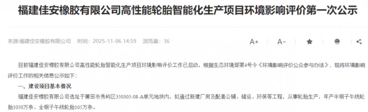 【炭黑產(chǎn)業(yè)網(wǎng)】11月7日消息,11月6日,福建莆田市秀嶼區(qū)發(fā)布的一則環(huán)評(píng)公示,正式披露了輪胎行業(yè)的一項(xiàng)重磅投資計(jì)劃。福建佳安橡膠有限公司計(jì)劃投建“高性能輪胎智能化生產(chǎn)項(xiàng)目”,該項(xiàng)目規(guī)劃的年產(chǎn)能規(guī)模達(dá)到1155萬條,引發(fā)行業(yè)廣泛關(guān)注。