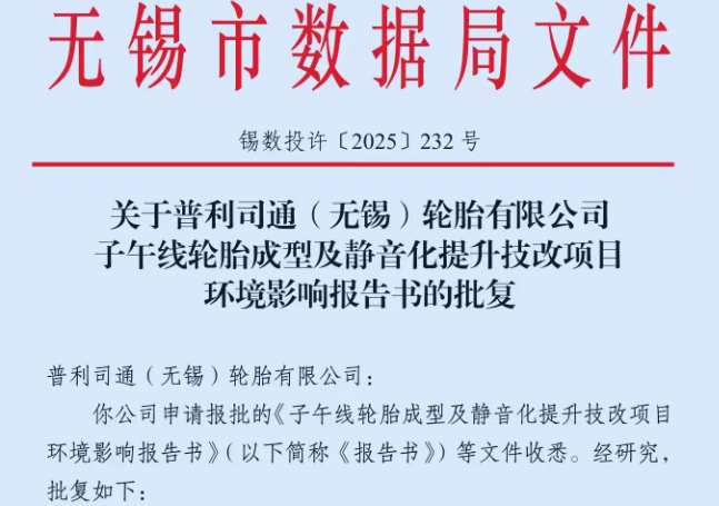 【炭黑產(chǎn)業(yè)網(wǎng)】11 月 10 日消息,普利司通(無錫)輪胎有限公司的 “子午線輪胎成型及靜音化提升技改項目” 于 2025 年 10 月 31 日正式取得無錫市數(shù)據(jù)局環(huán)保批復(批復文號:錫數(shù)投許〔2025〕232 號)。標志著該工廠在高端化升級與綠色化轉(zhuǎn)型的進程中實現(xiàn)關(guān)鍵突破,將通過技術(shù)革新進一步強化其在高端輪胎市場的競爭力。
