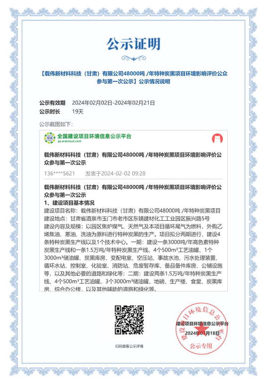 根據(jù)公示內(nèi)容,一期與二期項目共建設48000噸/年特種炭黑生產(chǎn)線,第一次公示期間項目名稱為“載偉新材料科技(甘肅)有限公司48000噸/年特種炭黑項目”,而后期因項目增加了三期工程建設內(nèi)容,項目名稱變?yōu)椤拜d偉新材料科技(甘肅)有限公司98000噸/年特種炭黑項目”。