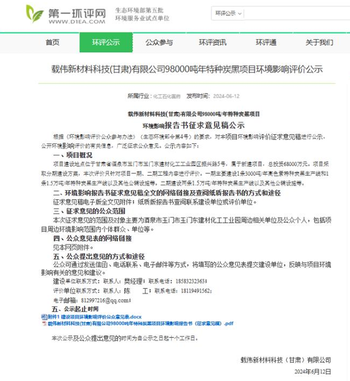 載偉新材料科技(甘肅)有限公司98000噸/年特種炭黑項目環(huán)境影響報告征求意見稿第二次公示原文顯示:“項目建設地點位于甘肅省酒泉市玉門市玉門東建材化工工業(yè)園區(qū)振興路5號, 屬于新建項目,總投資68000萬元。項目采取分期建設方案,本次評價只針對項目一期、二期工程內(nèi)容進行評價。一期主要建設1條3000噸/年高色素特種炭黑生產(chǎn)線和1條1.5萬噸/年特種炭黑生產(chǎn)線以及其他公輔設施等。二期建設兩條1.5萬 噸/年特種炭黑生產(chǎn)線以及其他公輔設施等。”