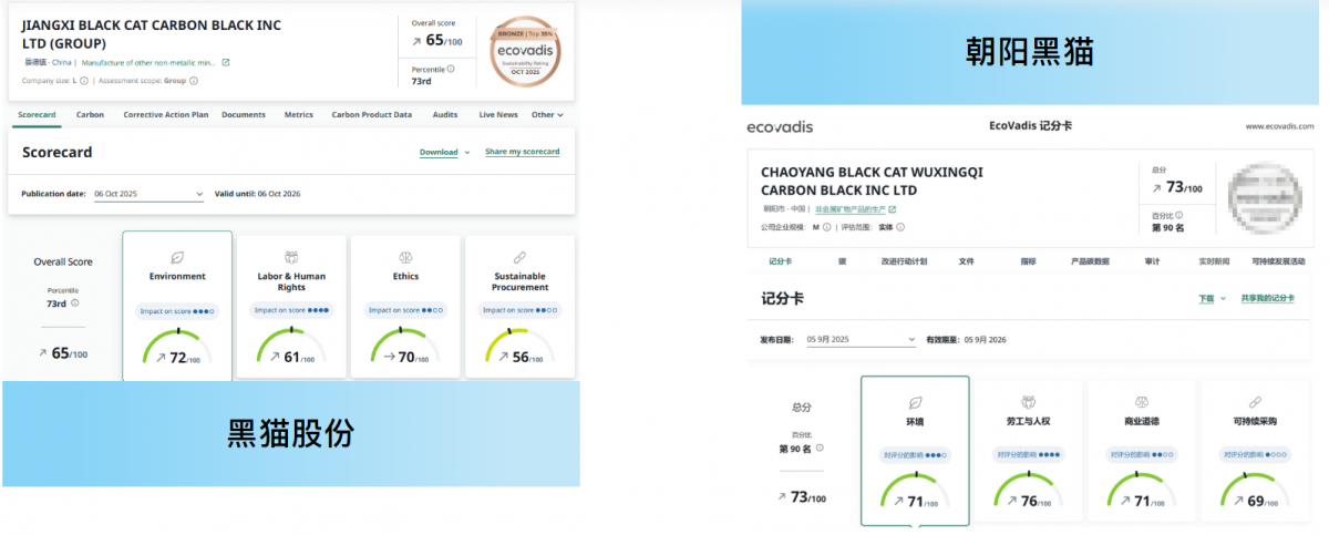 【炭黑產業(yè)網】11月18日消息,江西黑貓?zhí)亢诠煞萦邢薰?下稱“黑貓股份”)近期在EcoVadis企業(yè)社會責任評估中傳來捷報,其社會責任評級實現穩(wěn)步增長,從先前的63分提升至65分,連續(xù)兩年保持全球前35%的銅牌評級。與此同時,其下屬企業(yè)朝陽黑貓表現更為亮眼,評級從銅牌成功躍升至銀牌,躋身全球前15%行列。