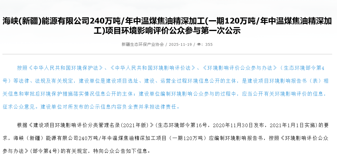 11月19日,海峽(新疆)能源有限公司240萬噸/年中溫煤焦油精深加工(一期120萬噸/年中溫煤焦油精深加工)項目環(huán)境影響評價公眾參與第一次公示。