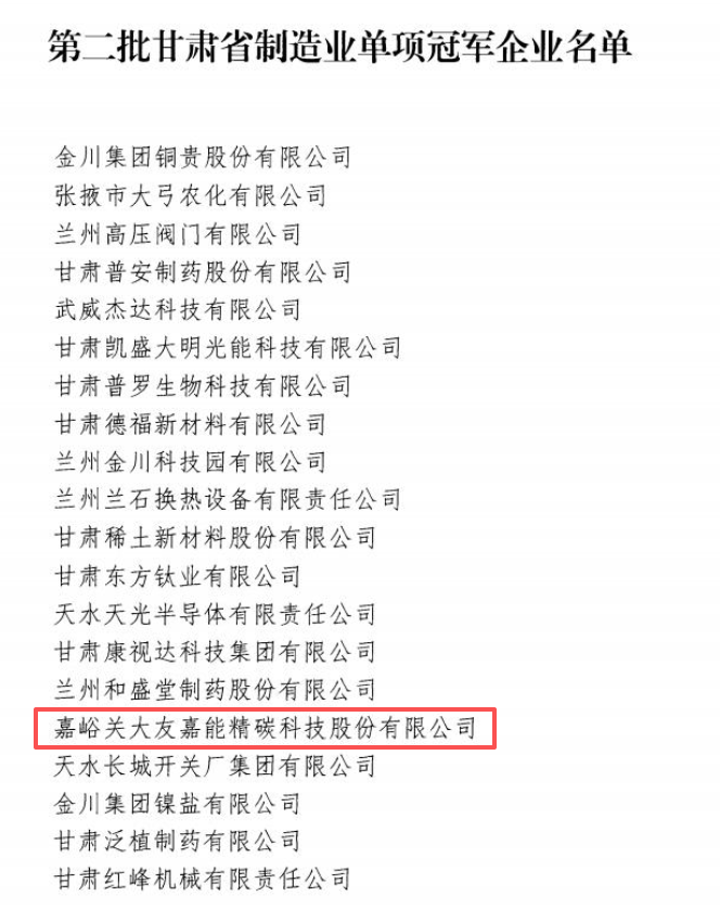 近日,甘肅省工業(yè)和信息化廳公布第二批省級(jí)制造業(yè)單項(xiàng)冠軍企業(yè)名單,20家企業(yè)入選,嘉峪關(guān)大友嘉能精碳科技股份有限公司榮登榜單。