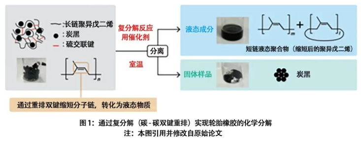 一直以來,天然橡膠類的聚異戊二烯可借助催化復(fù)分解反應(yīng)實現(xiàn)便捷分解,但廢舊輪胎中的硫化聚異戊二烯橡膠卻因硫成分會抑制復(fù)分解反應(yīng),成為回收領(lǐng)域的一大難題。為此,研究團隊將突破口放在為輪胎橡膠匹配適宜的催化劑與溶劑上,以此實現(xiàn)交聯(lián)結(jié)構(gòu)聚異戊二烯在溫和的近常溫條件下的化學分解。從工藝原理來看,分子間復(fù)分解反應(yīng)會讓聚異戊二烯分子間的碳 - 碳雙鍵重排,不過生成的分子鏈長度不均,難以直接獲取短分子鏈;而分子內(nèi)復(fù)分解反應(yīng)則會催生環(huán)狀聚異戊二烯,進而實現(xiàn)分子鏈的縮短。